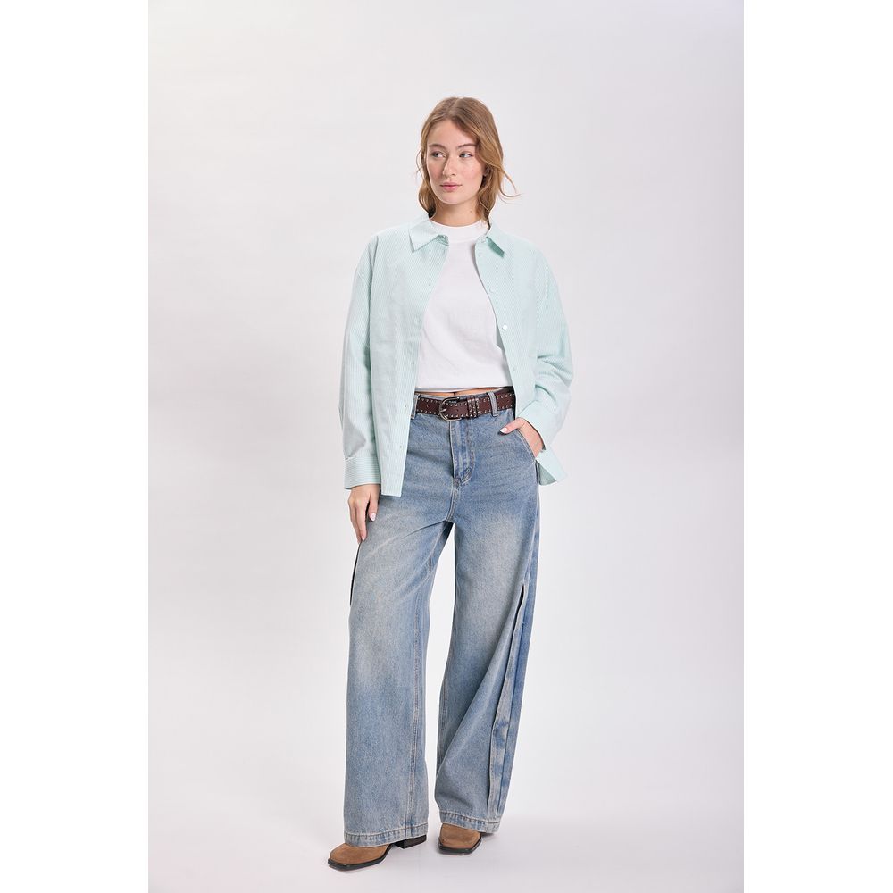 CAMISA DE JEAN MANGA GLOBO CON RECORTES AZUL