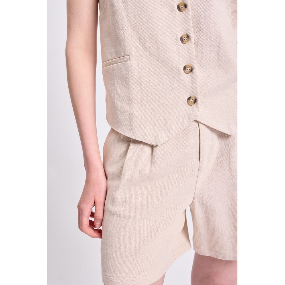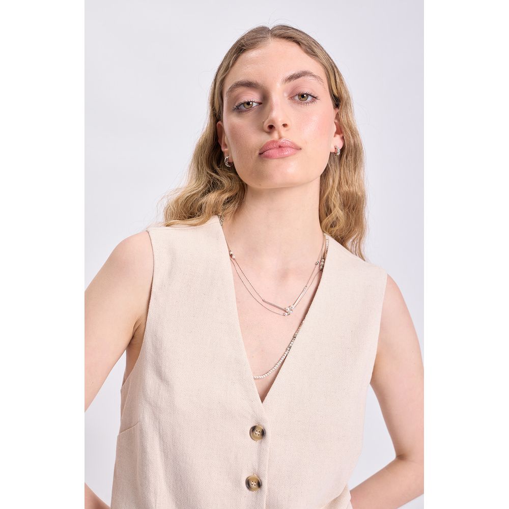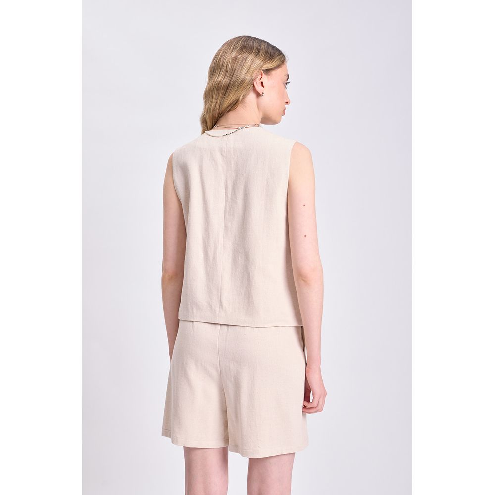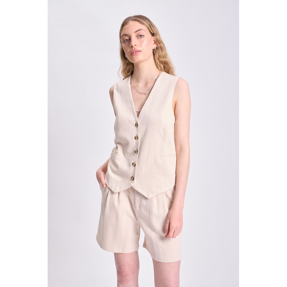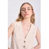 CHALECO CORTO LINO TWILL EN COLOR CRUDO — LA MODELO ESTÁ USANDO EL TALLE S