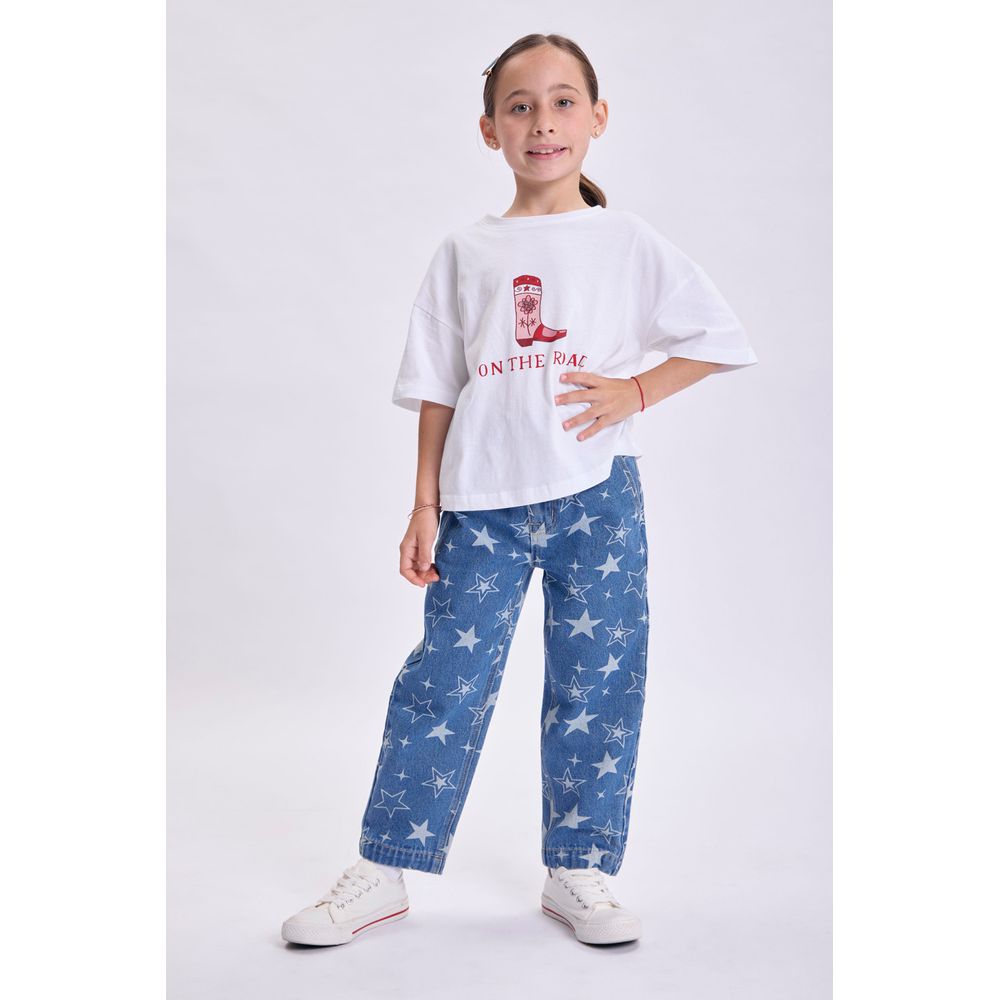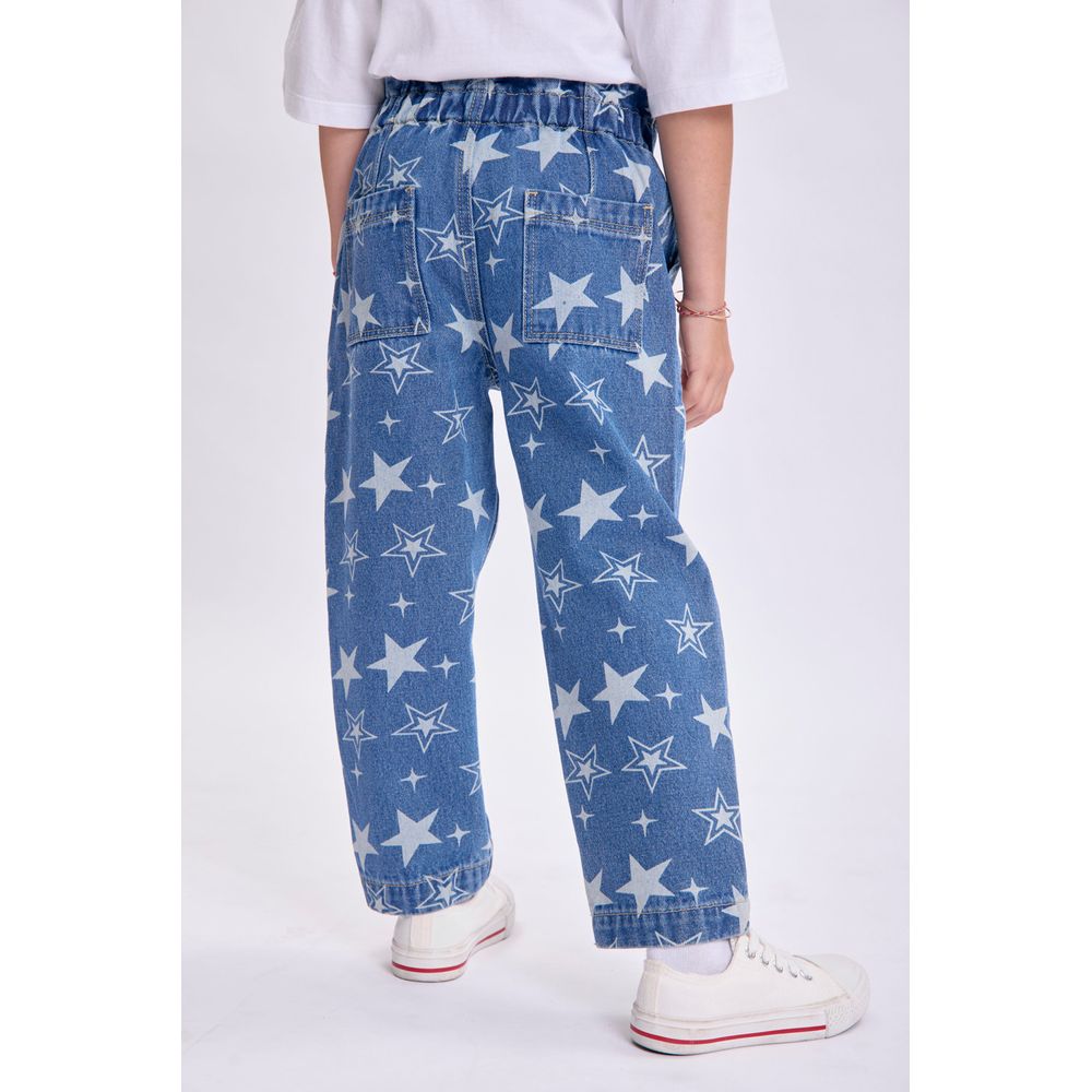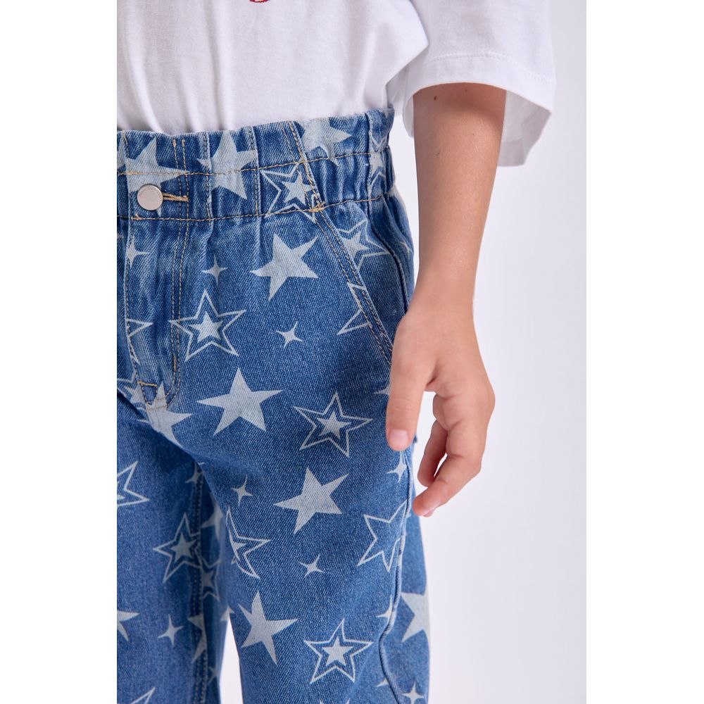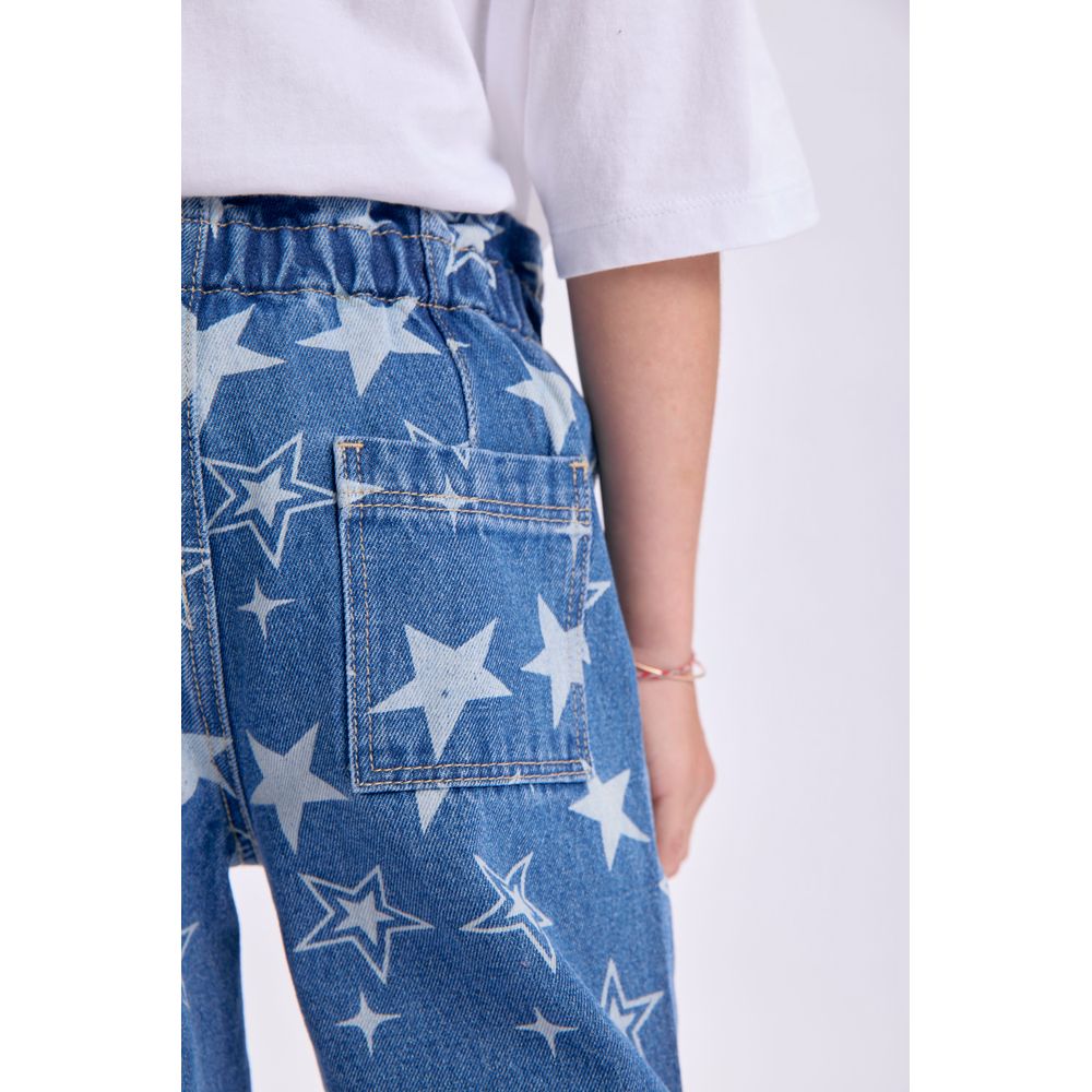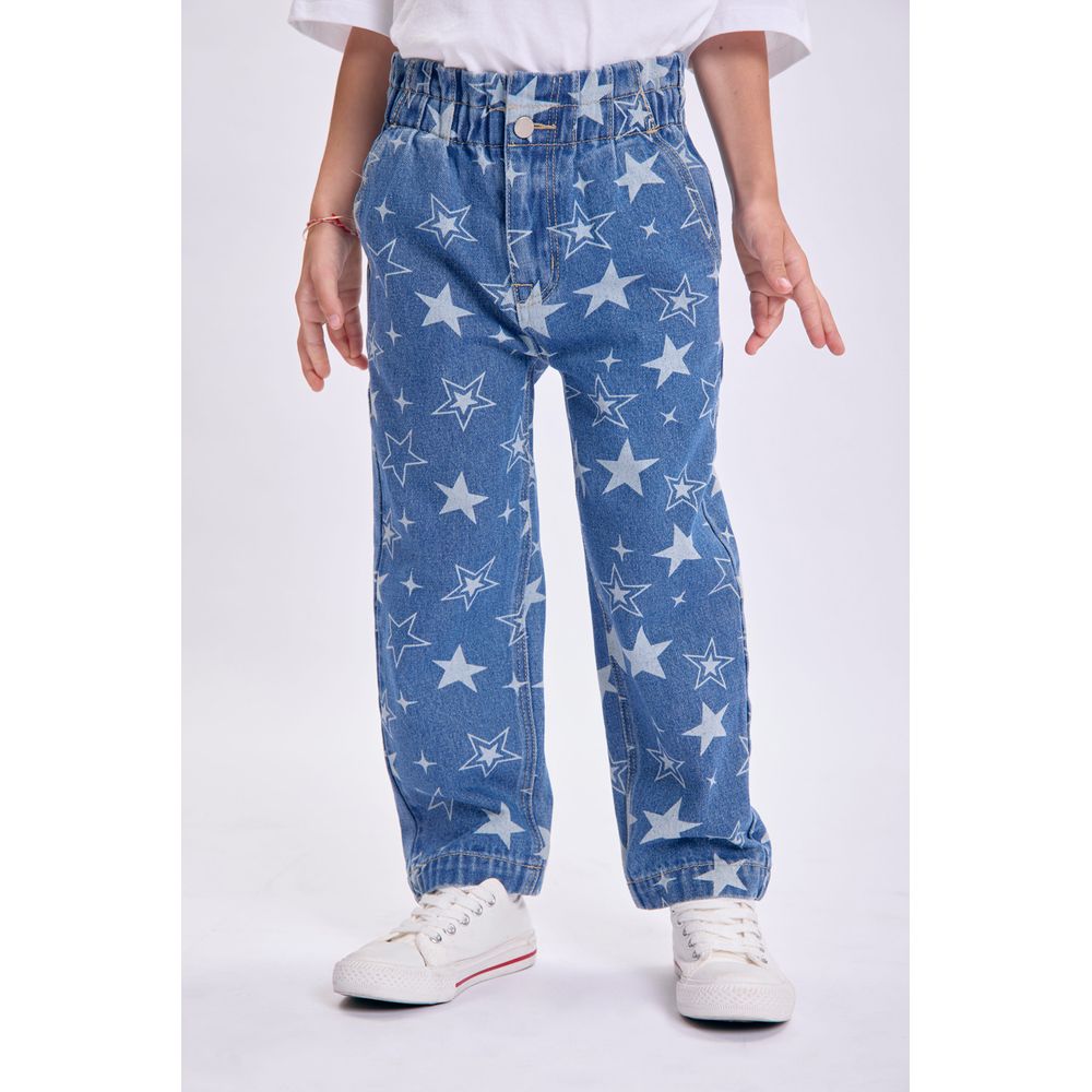 PANTALON JEAN PAPER BAG ESTAMPADO ESTRELLAS AZUL MEDIO