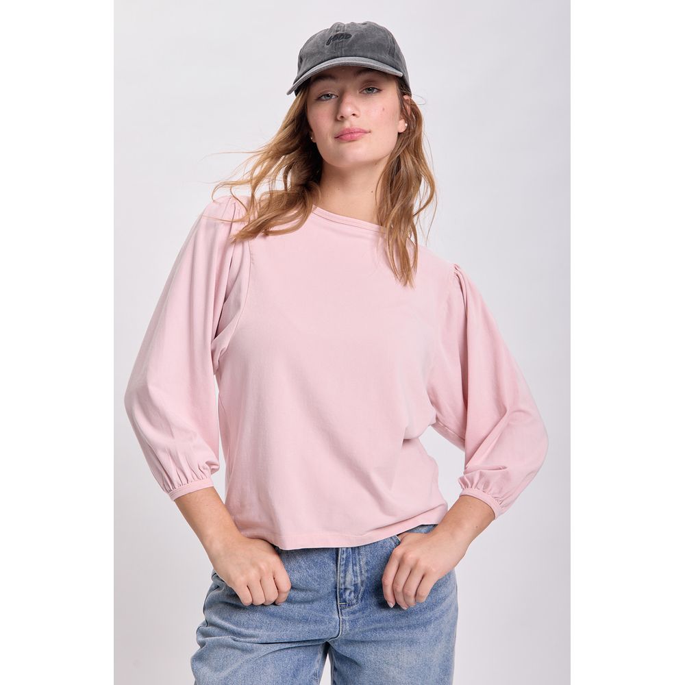 REMERA MANGA 3/4 CUELLO ALTO RAYADA ROSA