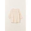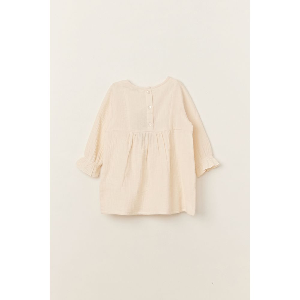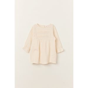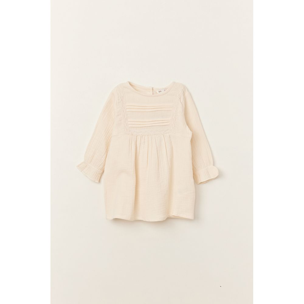 VESTIDO MANGA LARGA CON ALFORZAS Y CINTA EN PECHO CRUDO